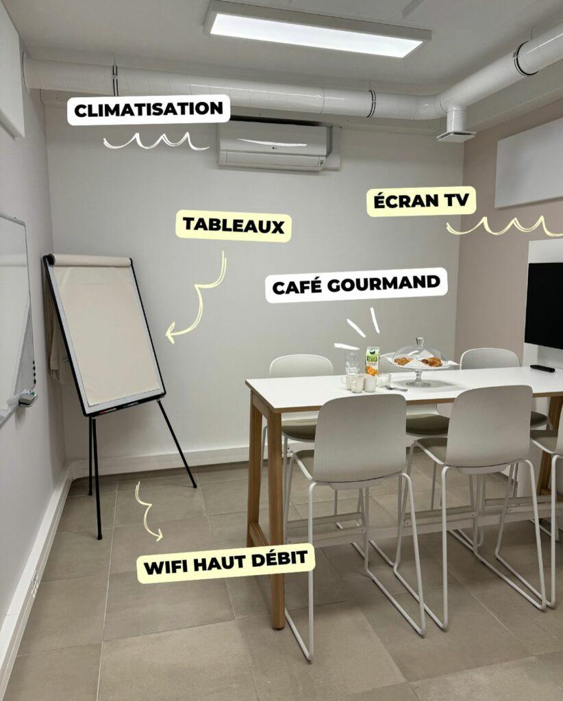Chaque salle est équipée pour accueillir vos réunions, formations ou sessions de coaching, avec des services inclus : Wi-Fi, vidéoprojecteur, paperboard et boissons.